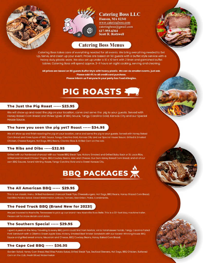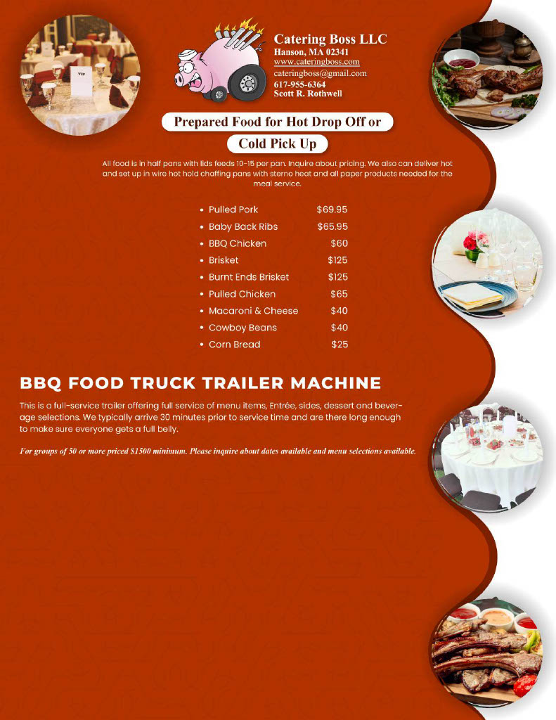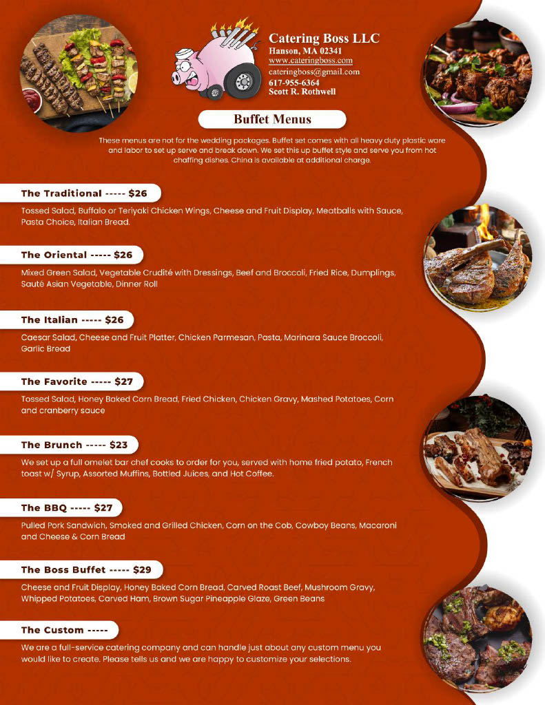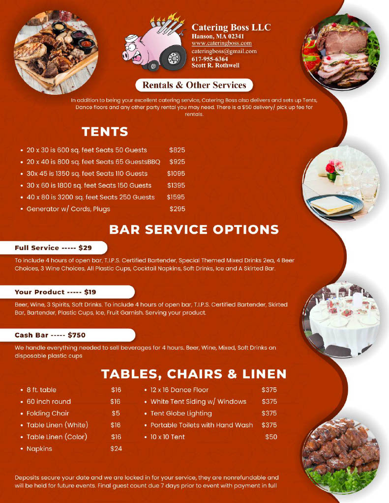 Catering Boss takes care of everything needed for all events. We bring everything needed to Set Up, Serve, and clean up your event. Prices are based on 50 guests with a buffet style service with a heavy duty plastic ware. We also set up under a 10 x 10 tent with 2 linen and garnished buffet tables. Catering Boss will spend approx. 3-4 hours on sight cooking, serving and cleaning.