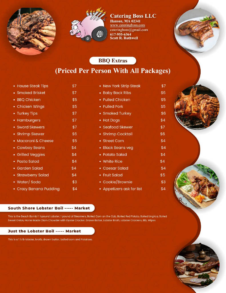 This is our classic menu. Grilled hardwood charcoal Steak Tips, Cheeseburgers, Hot Dogs, BBQ Beans, Honey Glazed Corn Bread, Red Bliss Potato Salad, Sliced Watermelon, Lettuce, Tomato, Red Onion, Pickle, Condiments.