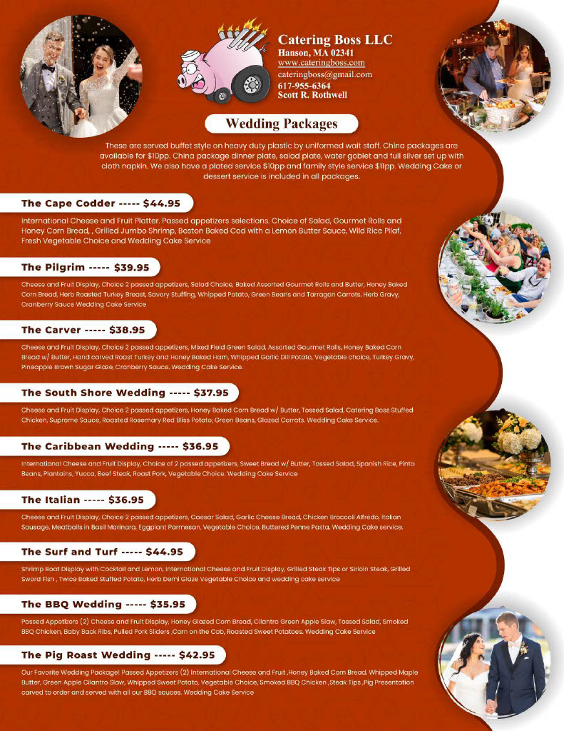 Cheese and Fruit Display, Choice 2 passed appetizers, Honey Baked Corn Bread w/ Butter, Tossed Salad, Catering Boss Stuffed Chicken, Supreme Sauce, Roasted Rosemary Red Bliss Potato, Green Beans, Glazed Carrots. Wedding Cake Service.