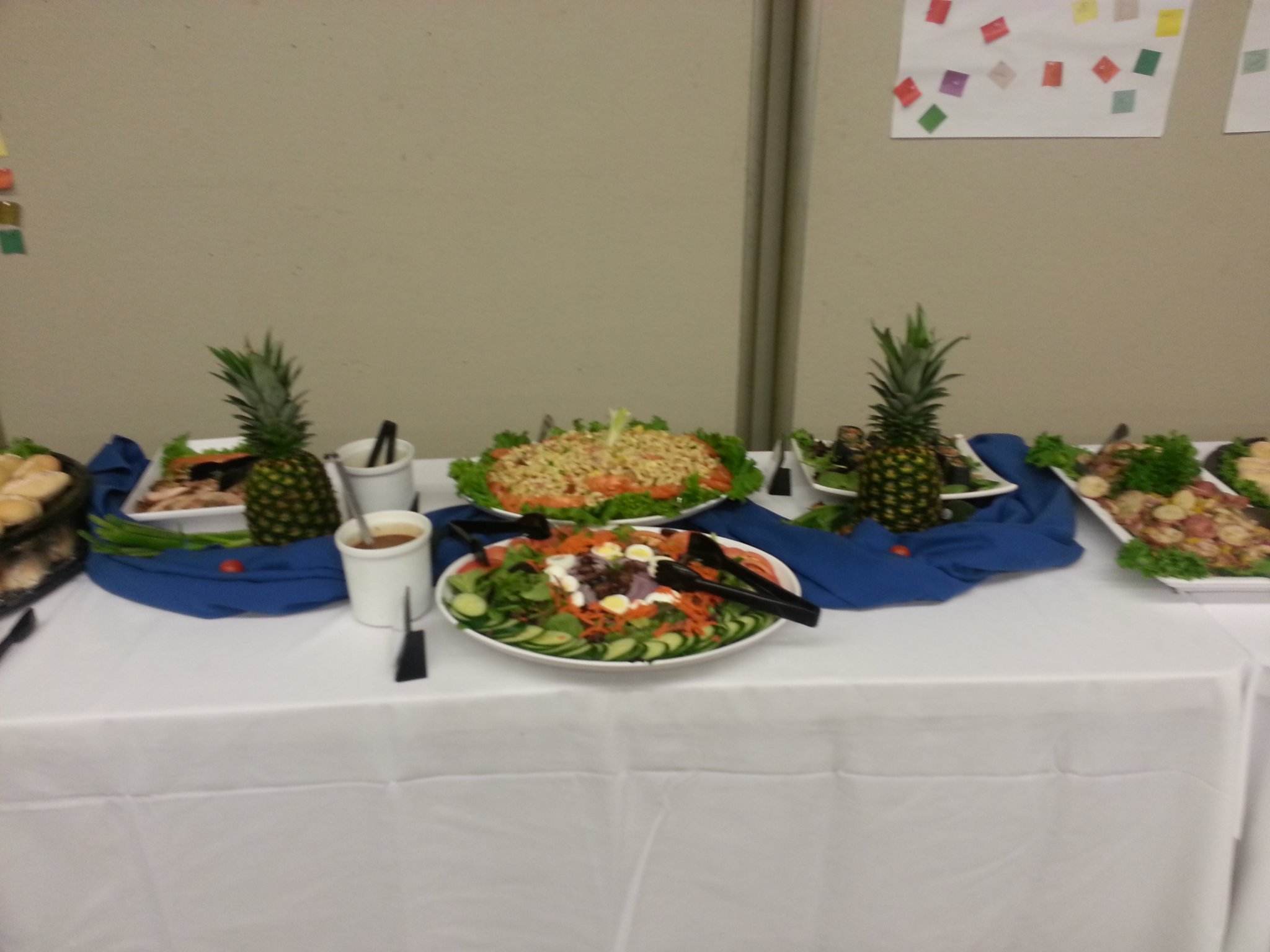 Tossed Salad, Buffalo or Teriyaki Chicken Wings, Cheese and Fruit Display, Meatballs with Sauce, Pasta Choice, Italian Bread.